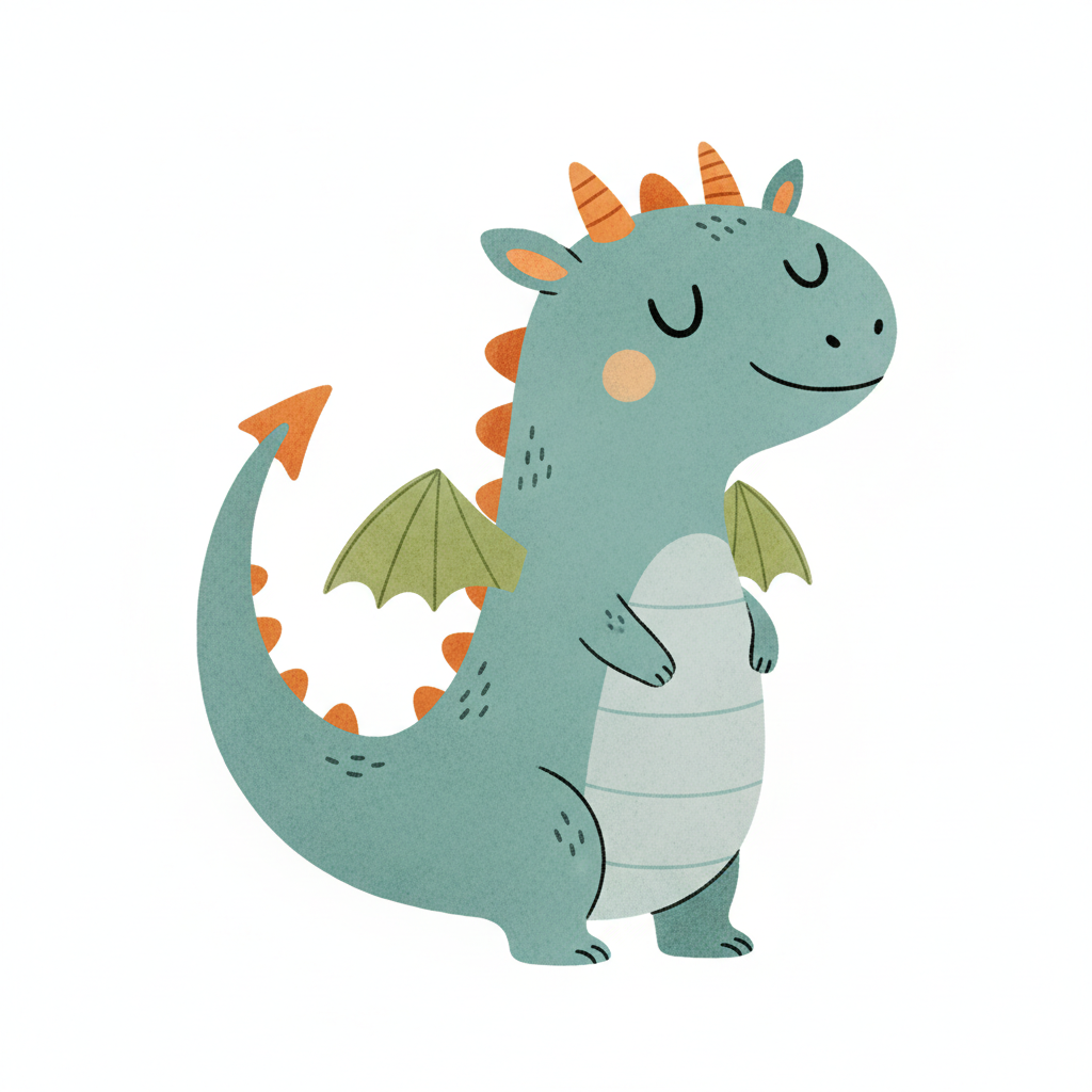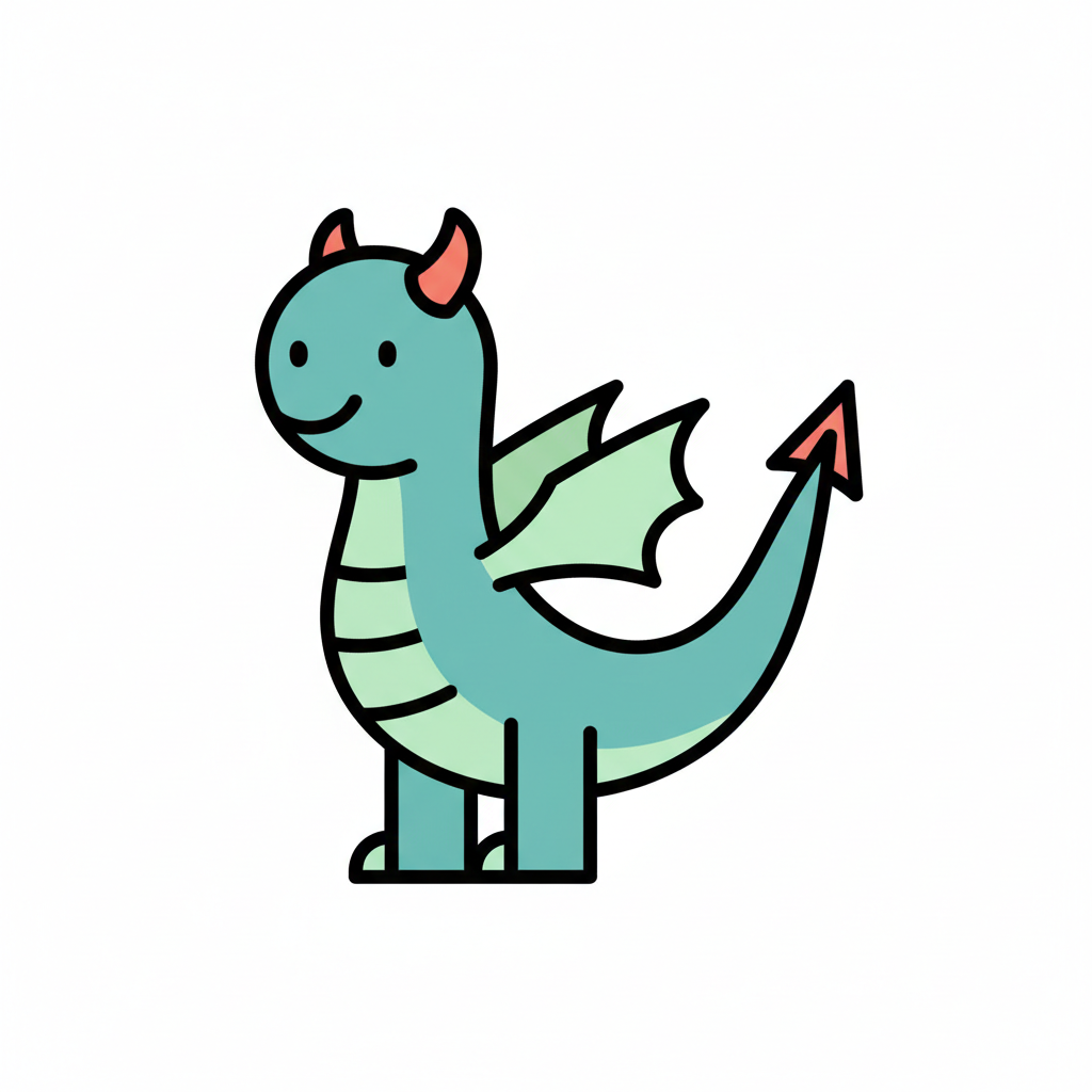 Niedlicher, lächelnder Zeichentrickdrache in Türkis mit orangefarbenen Hörnern und grünen Flügeln.