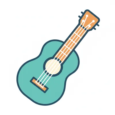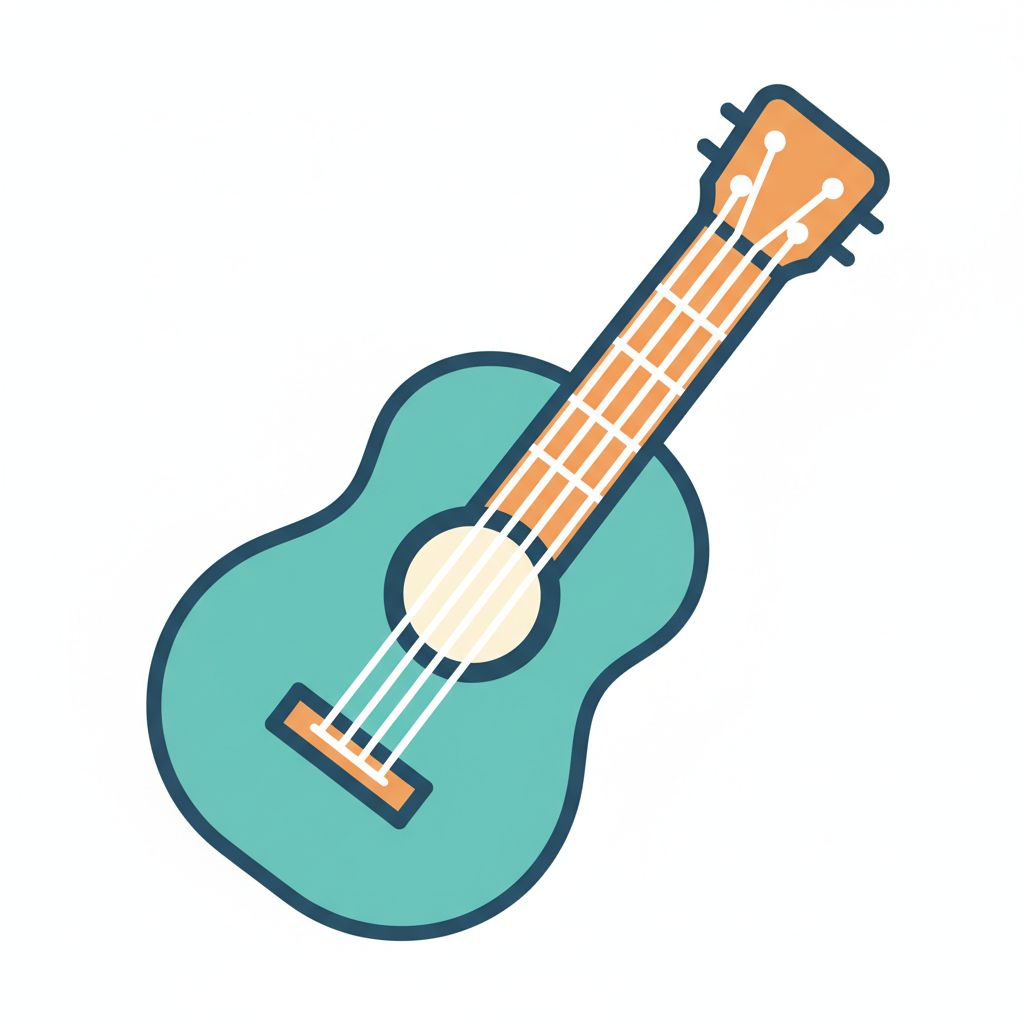 Türkise Ukulele/Gitarre im Cartoon-Stil auf weißem Hintergrund.