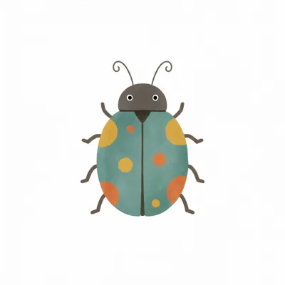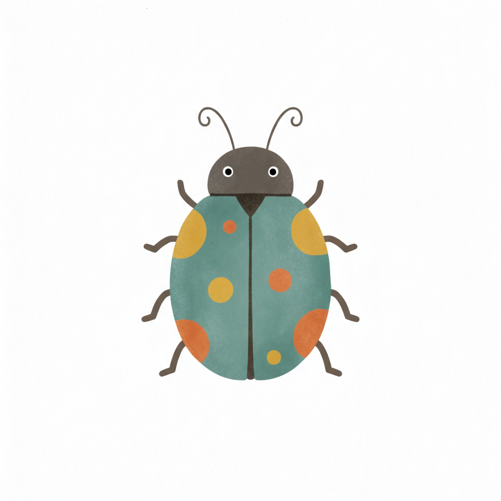 Niedlicher, gezeichneter Marienkäfer in Türkis mit orangefarbenen und gelben Punkten auf weißem Grund.