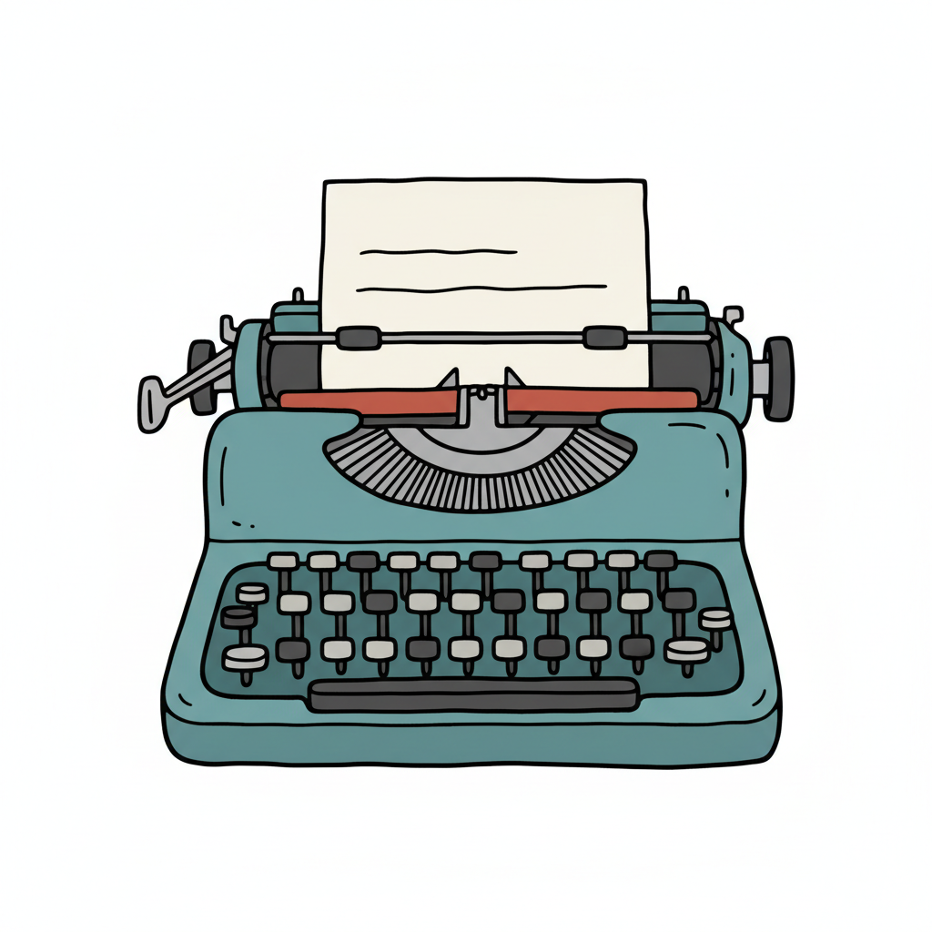 Eine handgezeichnete, türkise Schreibmaschine mit Papier, im Cartoon-Stil.