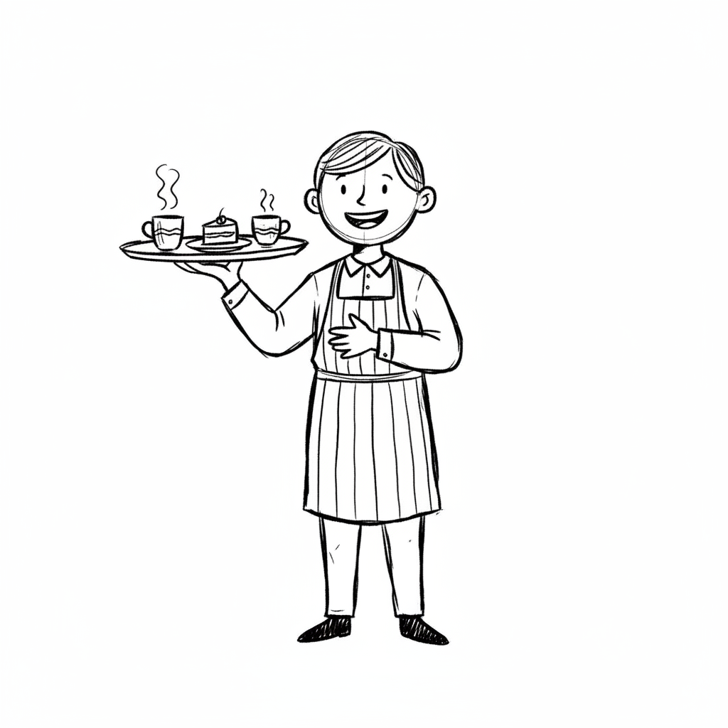 Ein lächelnder Cartoon-Kellner in Schürze trägt ein Tablett mit zwei Speisen.