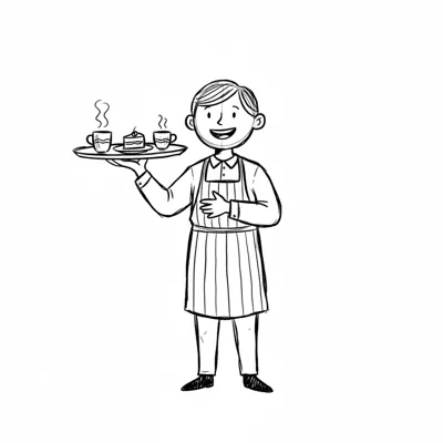 Schwarz-weiß-Cartoon eines lächelnden Kochs/Kellners mit Kochmütze und Schürze, der eine Tasse Tee auf einem Tablett serviert.