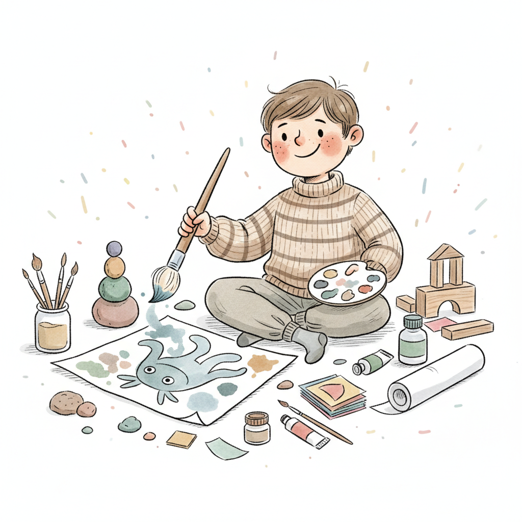 Junge malt fröhlich ein Bild auf dem Boden, umgeben von Malutensilien und Spielzeug.