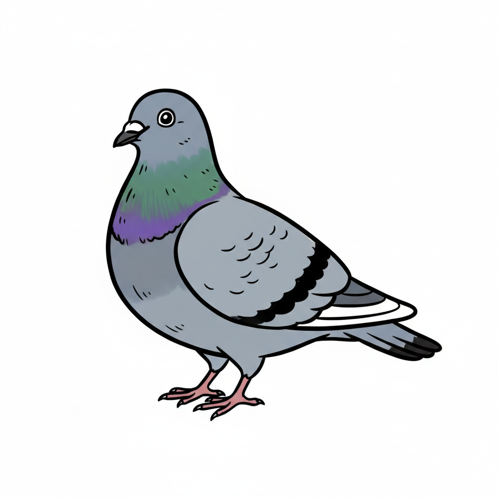 Eine Cartoon-Darstellung einer Taube mit buntem Gefieder.