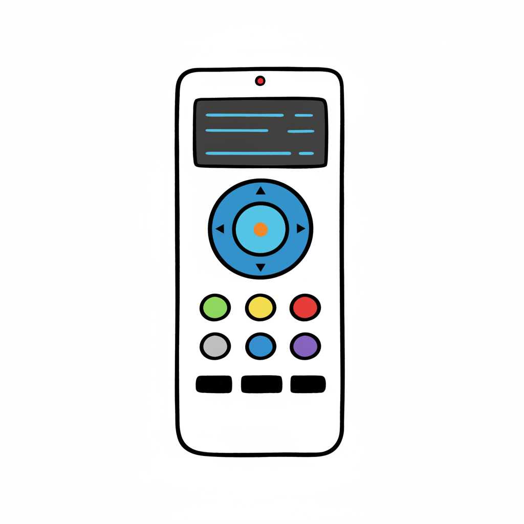 Fernbedienung mit bunten Tasten und einer zentralen Steuerung.