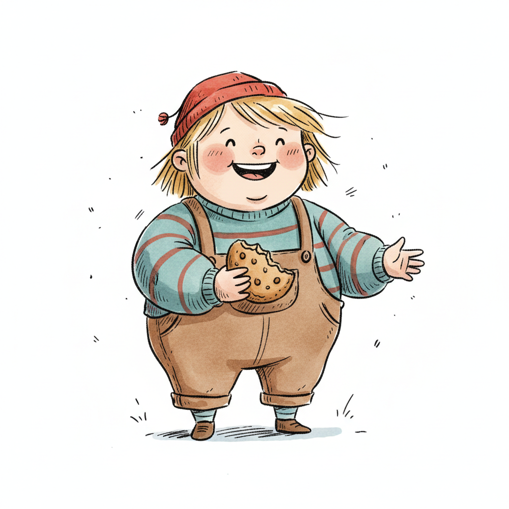 Niedliche, kindgerecht illustrierte Szene mit einem Kind oder einer Person als Hauptfigur, vor rein weißem Hintergrund, im frech-nordischen Aquarell-Skizzenstil. Klare, leicht wackelige Tuschekonturen, sichtbare Pinsel- und Strichtextur, dezente Schraffuren, weiche handgemalte Farbflächen in gedeckten Farben. Einfache, runde Formen. Keine harten Schatten, sondern sanfte, transparente Aquarellschichten. Leicht raue, handgezeichnete Linien statt glatter Vektorkanten. Subtile, vereinzelte Kritzelpunkte oder kleine Details im Hintergrund (wie Pünktchen oder feine Striche), aber keine echte Umgebung oder Landschaft. Die Figur ist mittig zentriert. Insgesamt charmant, humorvoll, warm und handgemacht wirkend. WICHTIG: Das Bild darf ABSOLUT KEINEN TEXT, KEINE BUCHSTABEN und KEINE ZAHLEN enthalten.