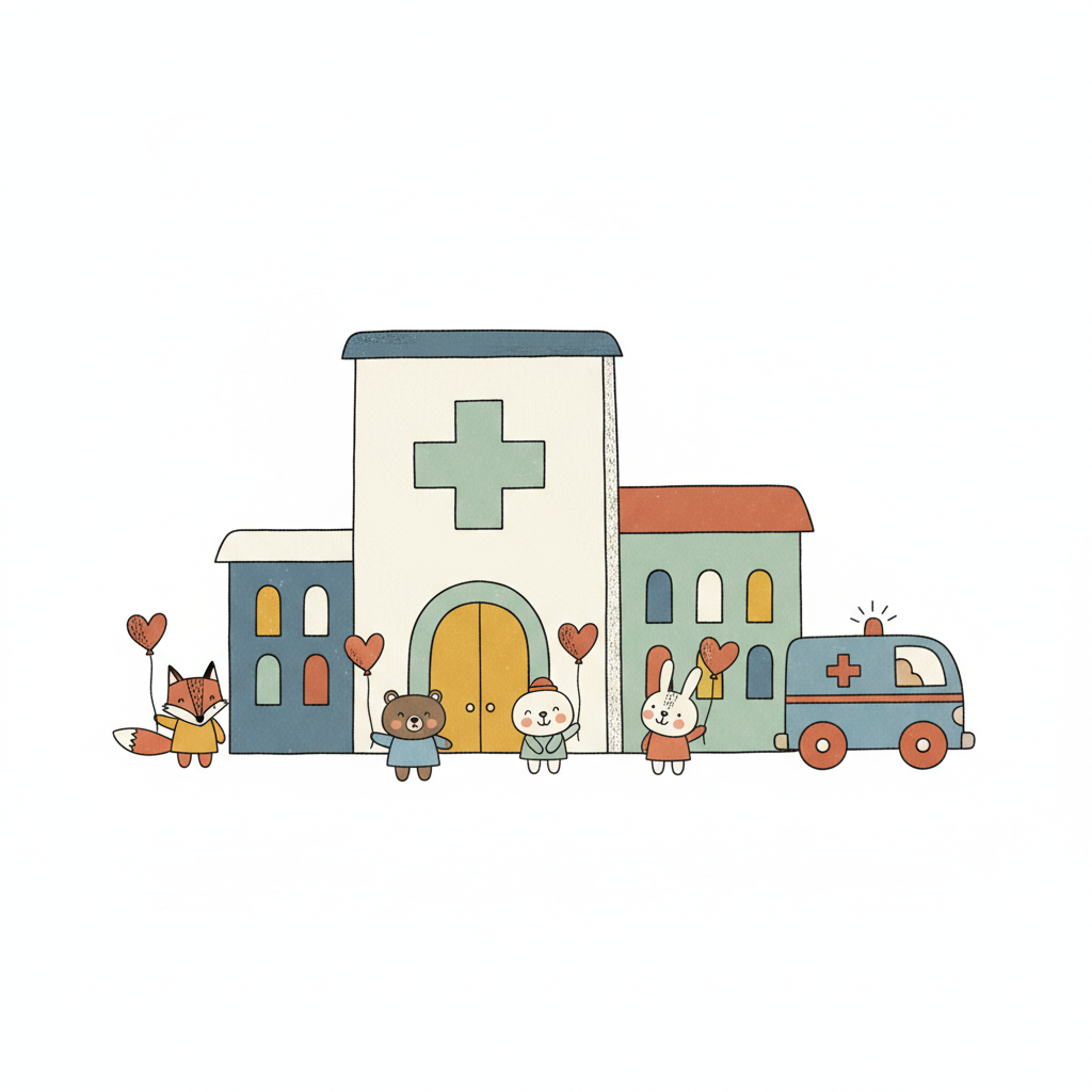 Niedliches Krankenhaus mit Tieren und Herzen, die Zuneigung zeigen.