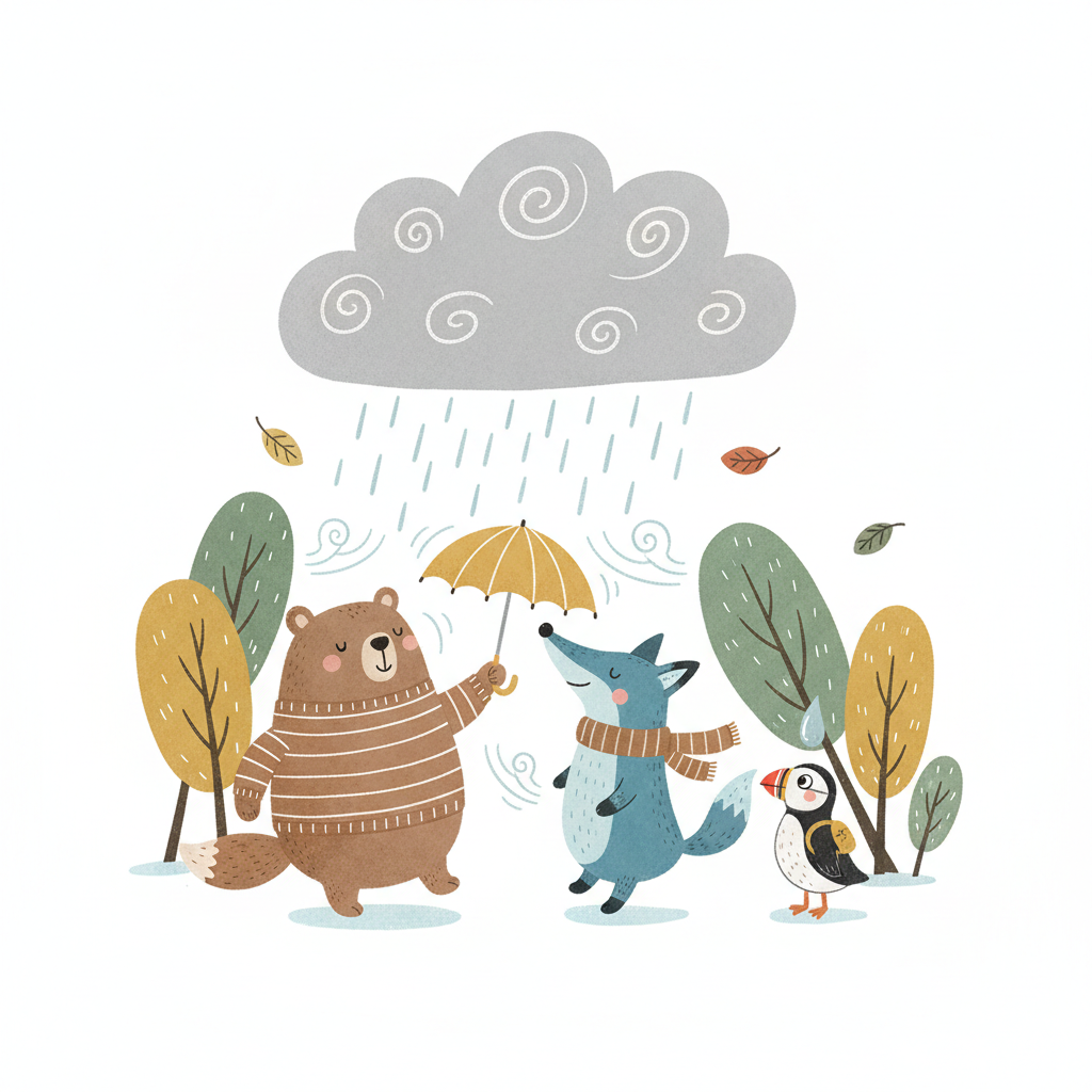 Bär, Fuchs und Vogel stehen unter einem Regenschirm im Regen.