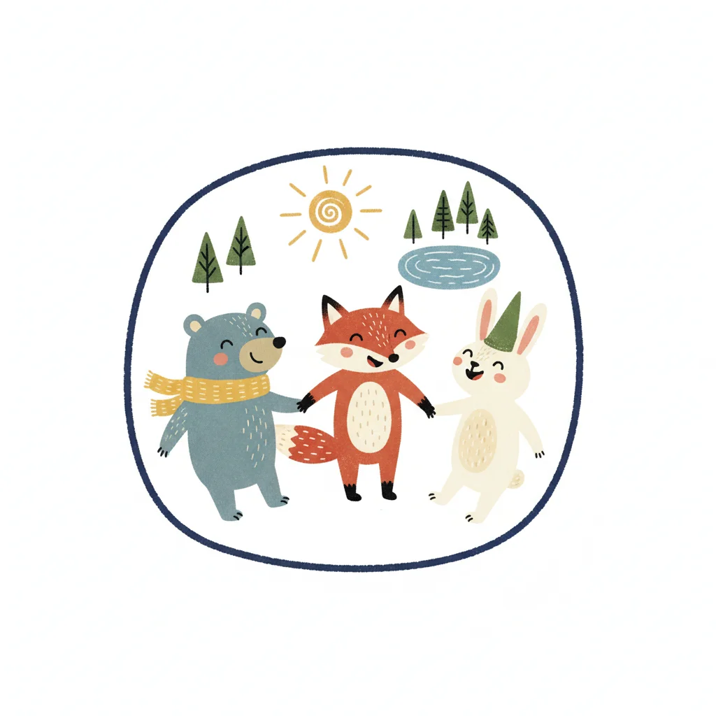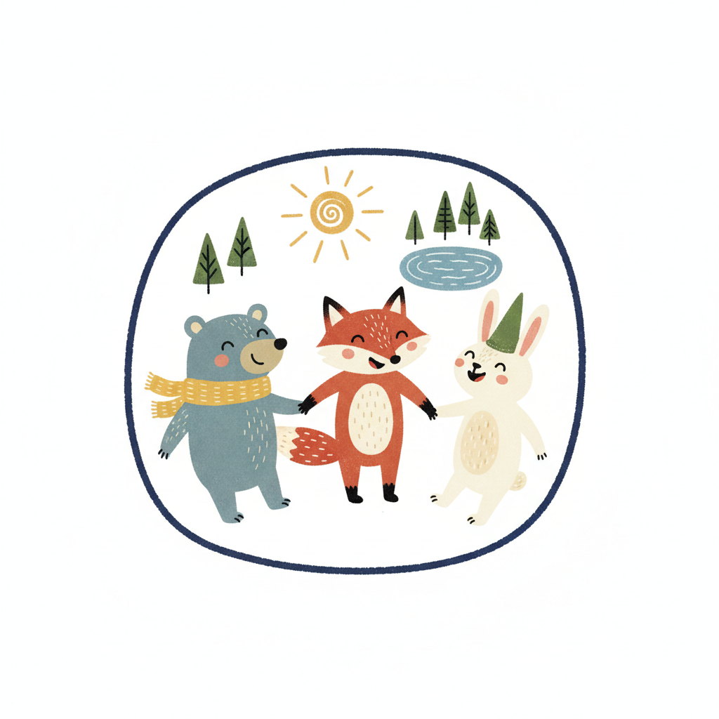 Eine Illustration mit Tieren und Blumen in einer fröhlichen Landschaft.