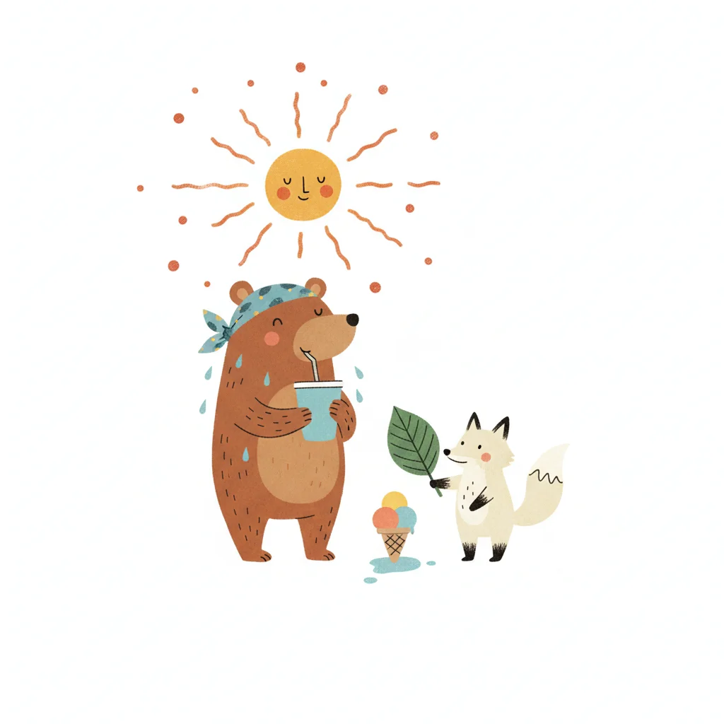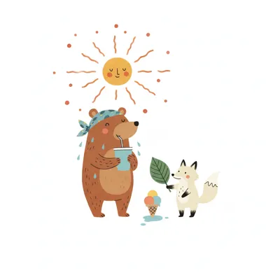 Bär und Fuchs genießen einen sonnigen Tag mit Getränken und Eis.