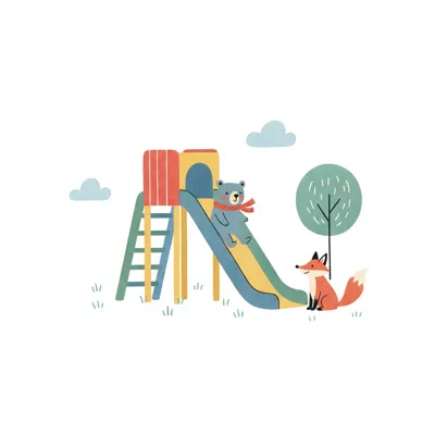 Ein bär und ein fuchs spielen auf einem Spielplatz mit Rutsche.