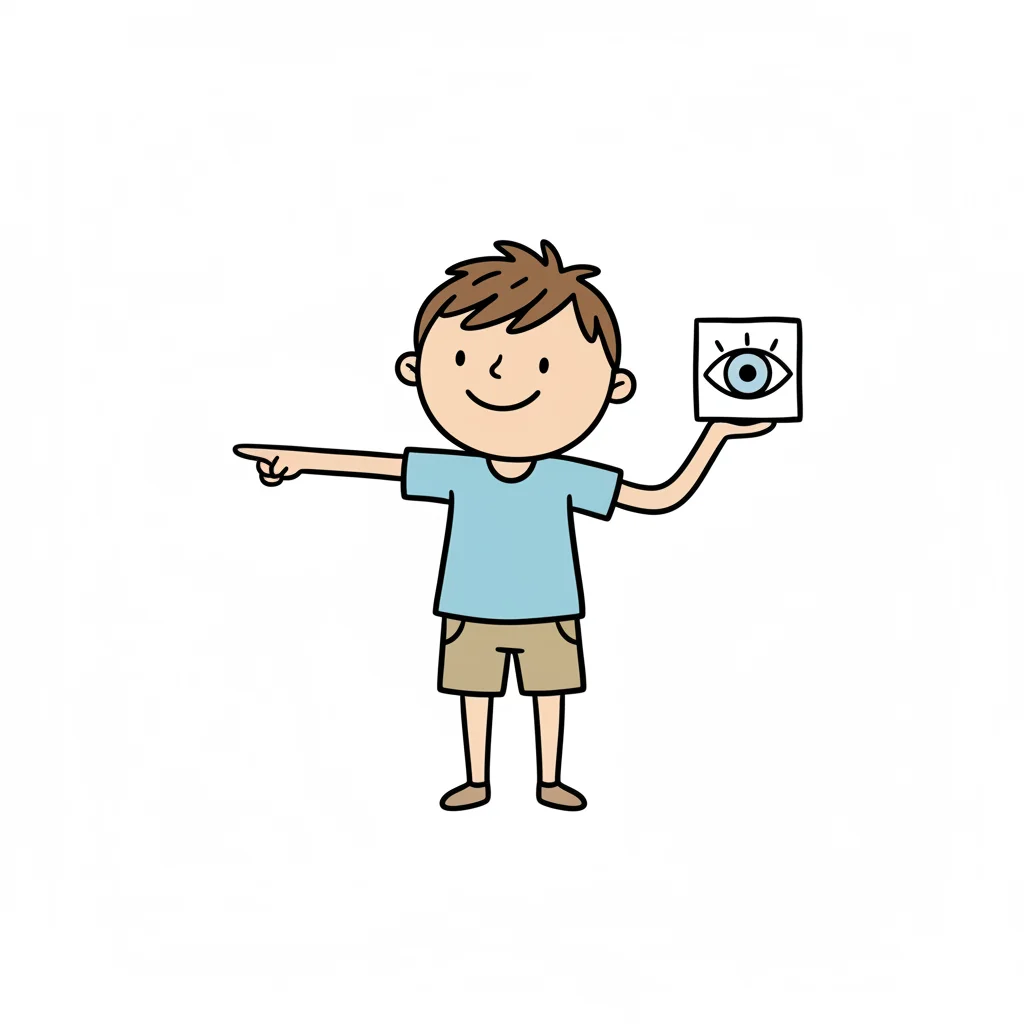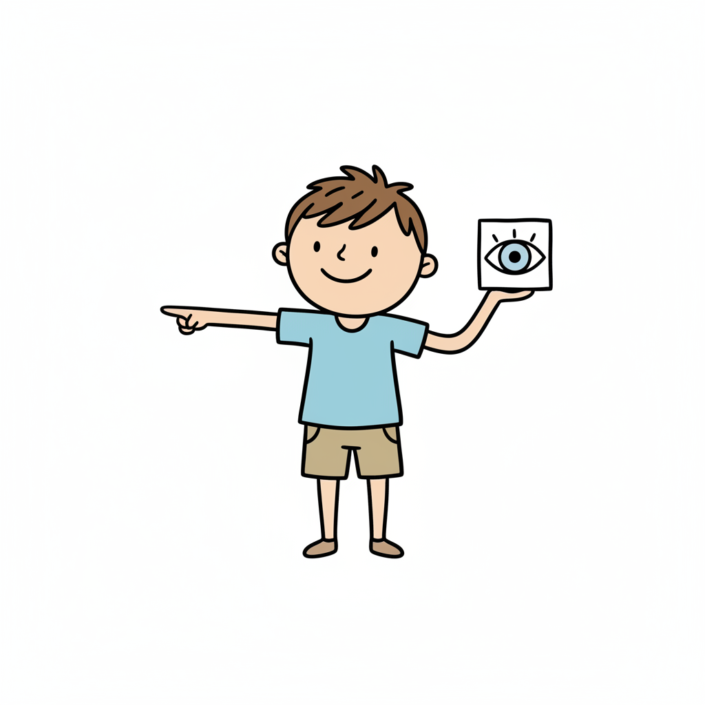 Ein lächelnder Cartoon-Junge zeigt nach links und hält ein Quadrat mit einem Augensymbol.