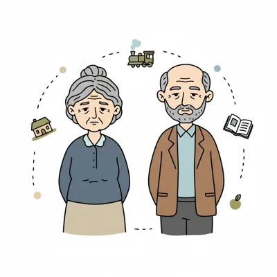 Trauriges älteres Paar, umgeben von Symbolen wie Haus, Zug, Buch und Apfel.