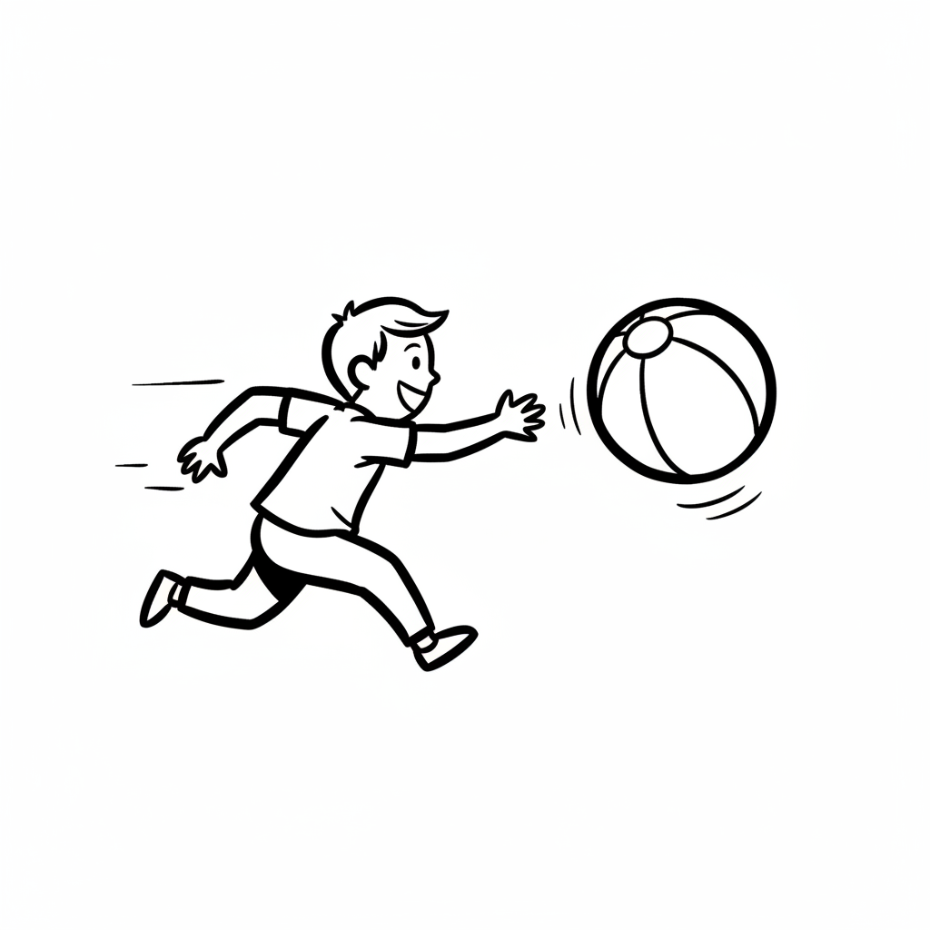 Strichzeichnung: Ein lachender Junge rennt und versucht, einen Ball zu fangen.