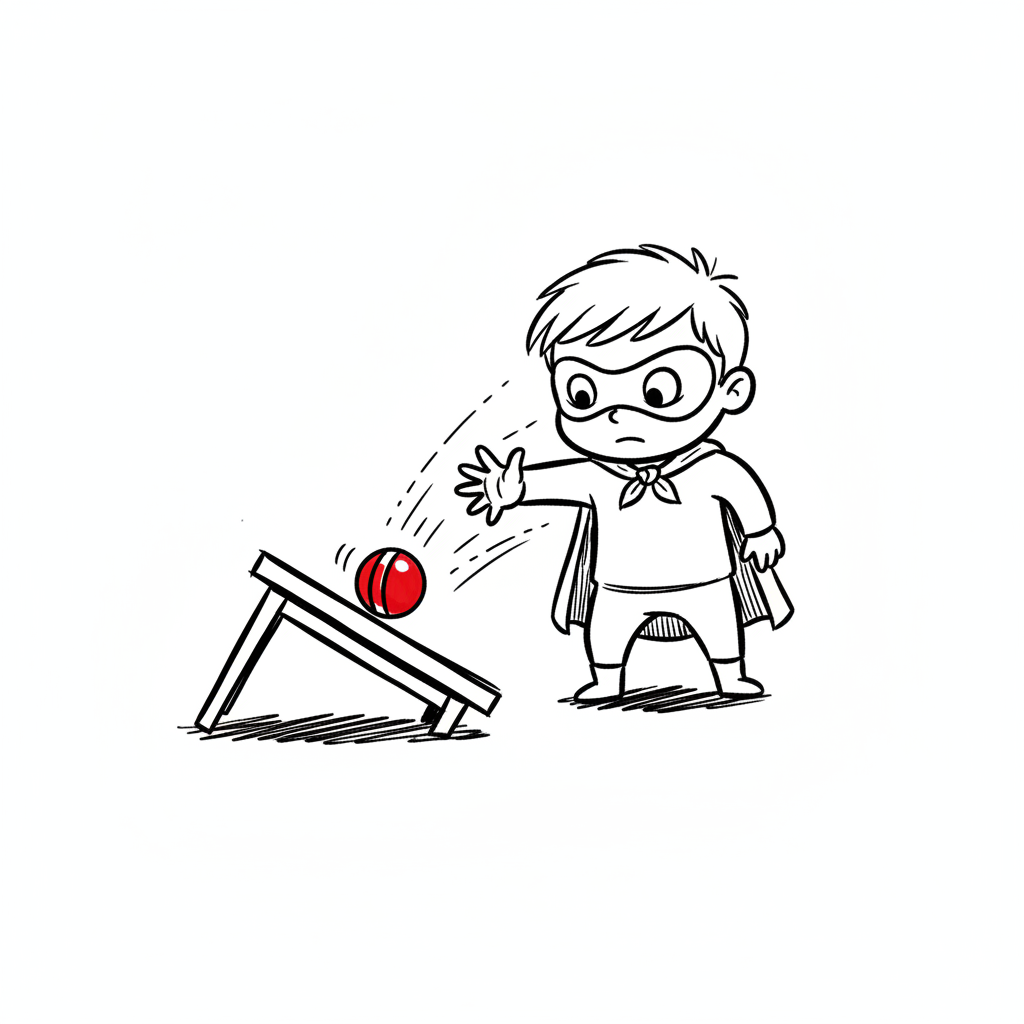 Ein kleiner Superheld versucht, einen roten Ball auf einer schiefen Ebene mit Telekinese zu beeinflussen.