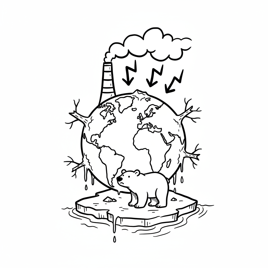 Cartoon: Erde mit rauchendem Schornstein, schmelzendem Eis und Eisbär. Symbol für Klimawandel.