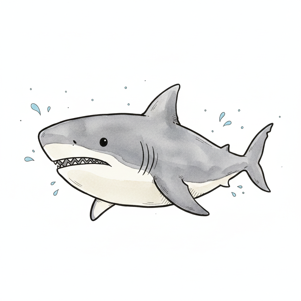Niedlicher Cartoon-Hai mit offenem Maul und Zähnen, umgeben von Wasserspritzern auf weißem Grund.