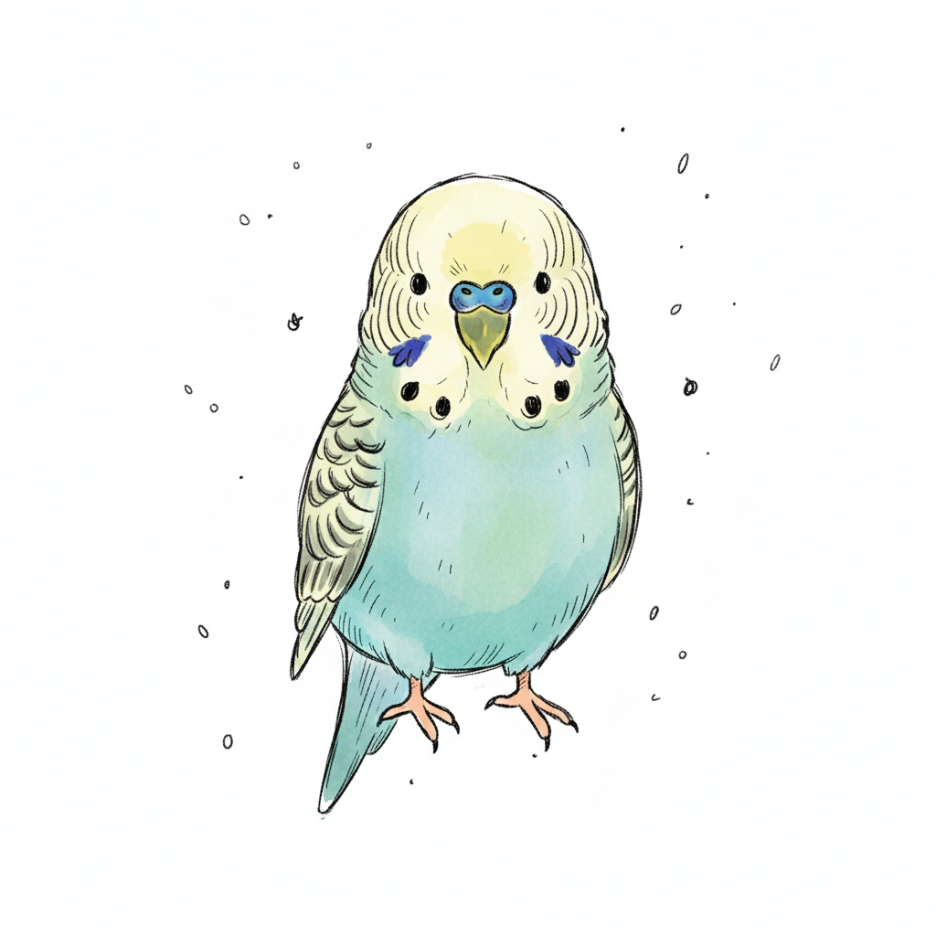 Niedliche Illustration eines Wellensittichs in Blau und Gelb auf weißem Hintergrund.