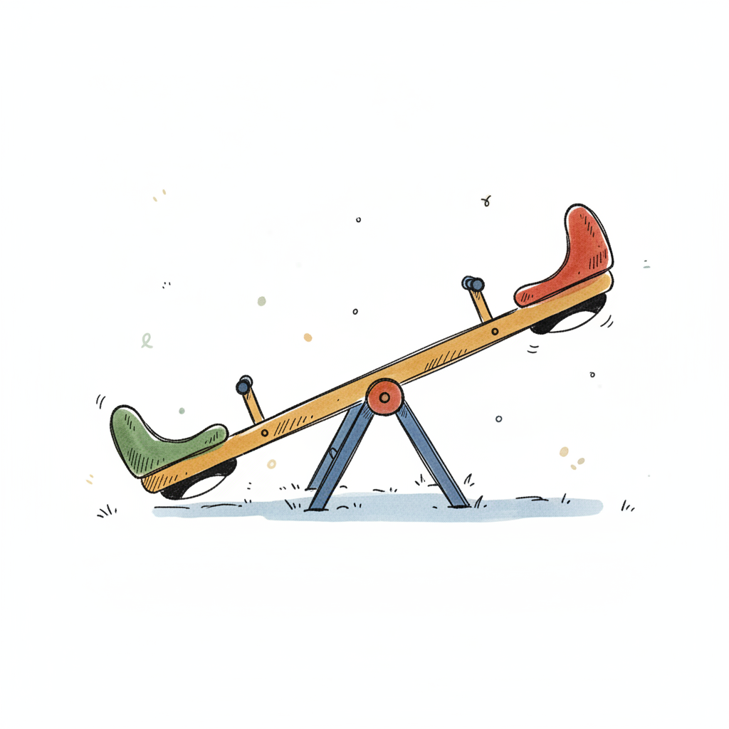 Bunte Wippe mit roten und grünen Sitzen im Cartoon-Stil auf weißem Hintergrund.