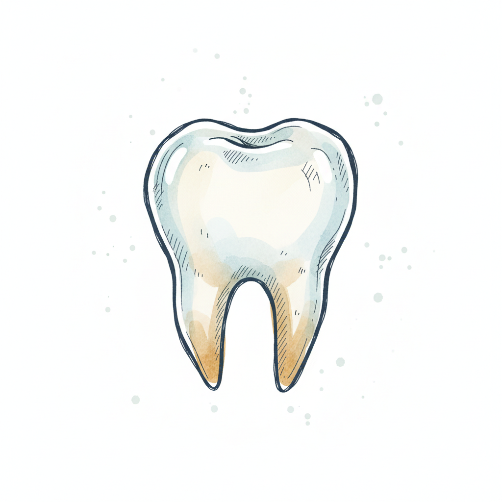 Handgezeichnete Aquarell-Illustration eines Zahns mit Wurzeln auf weißem Hintergrund.