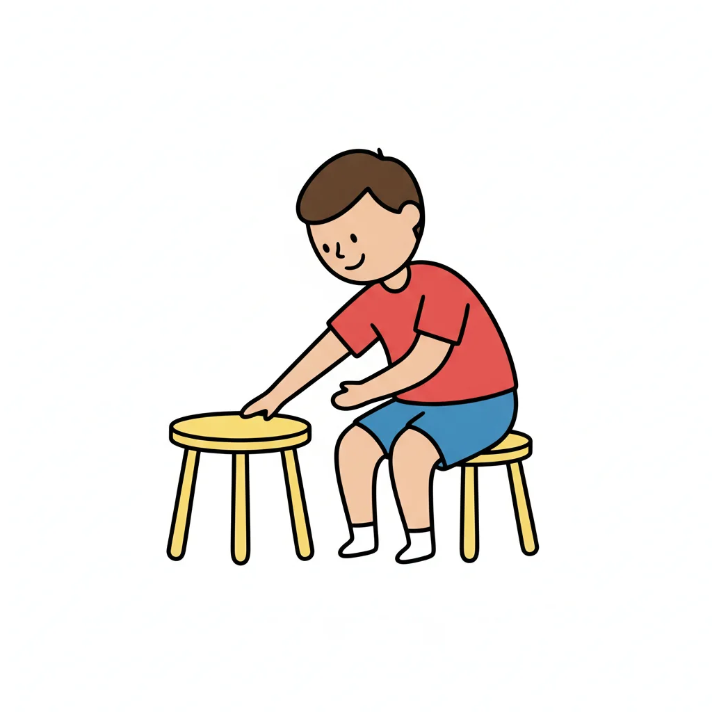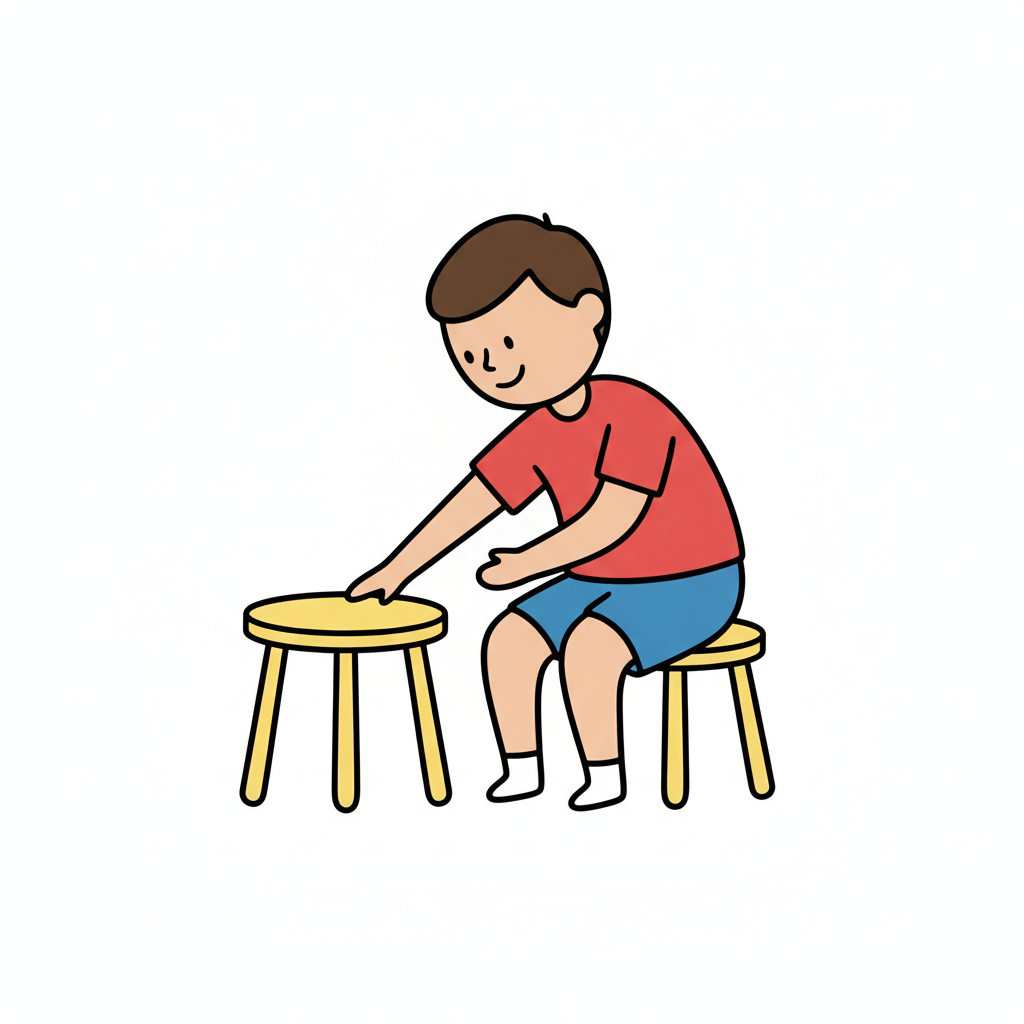 Ein lächelnder Junge sitzt auf einem Hocker und berührt einen zweiten Hocker.