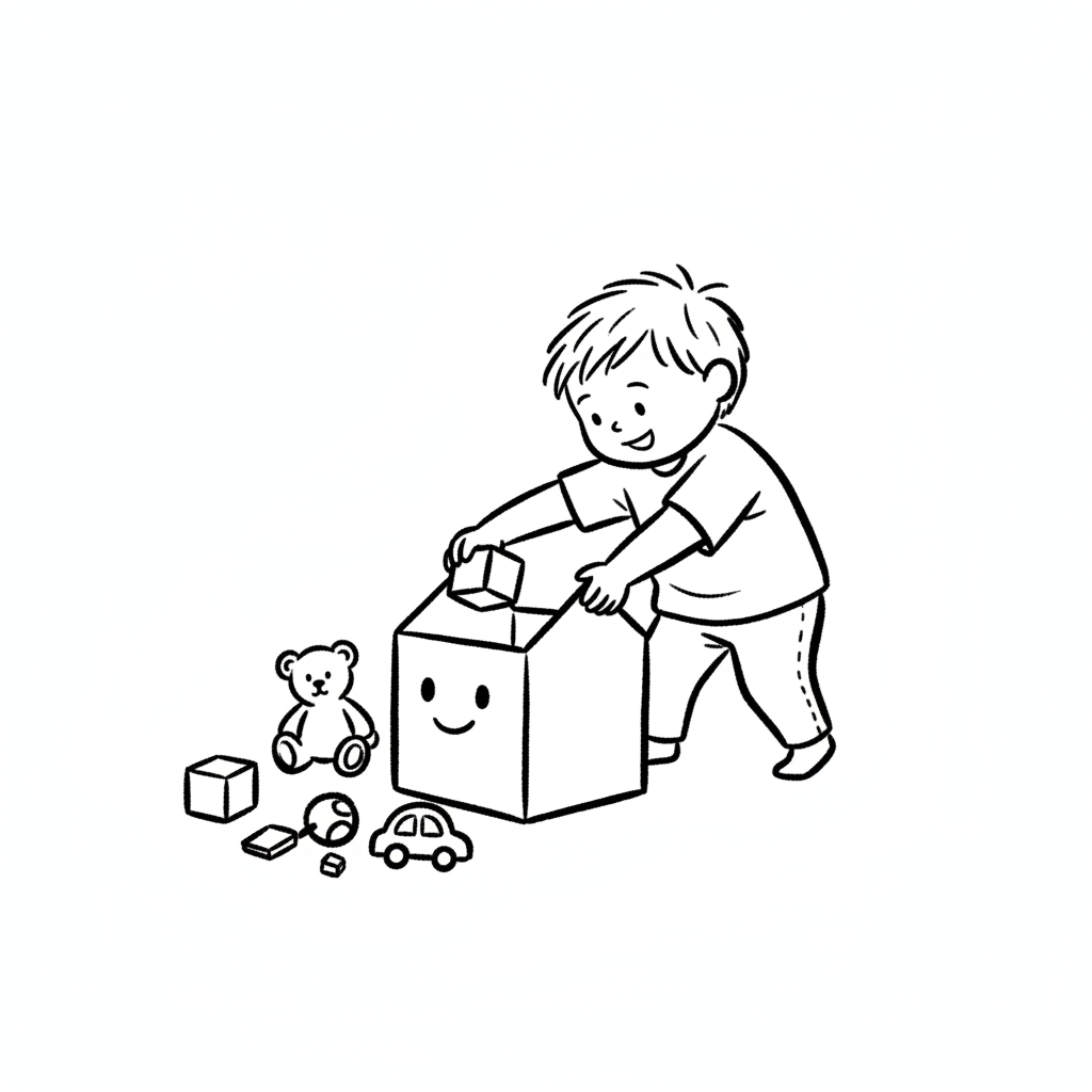 Ein Kind räumt einen Bauklotz in eine lächelnde Kiste, umgeben von Teddy, Auto und weiteren Spielsachen.