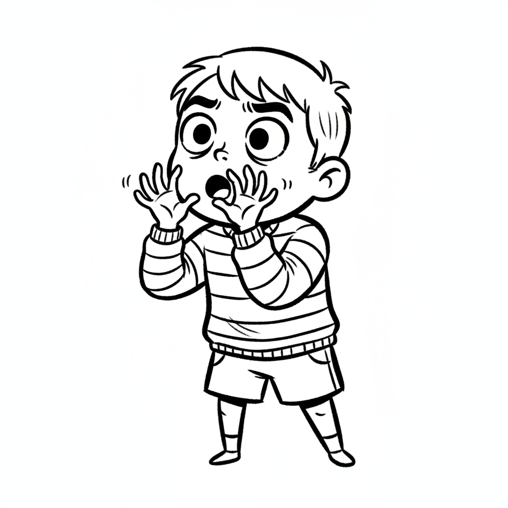 Schwarz-weißer Cartoon-Junge mit schockiertem Ausdruck, Hände am Mund, Augen weit geöffnet.