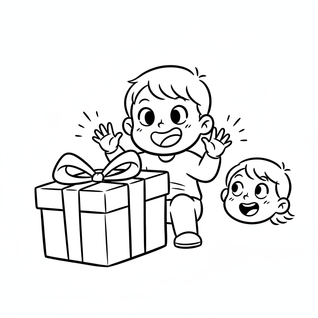 Ein glückliches Kind sitzt vor einem Geschenk, die Hände vor Freude erhoben. Ein weiterer Kinderkopf lacht.