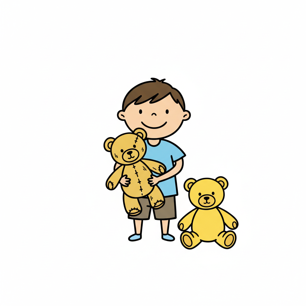 Ein lächelnder Junge hält einen Teddybär, ein weiterer sitzt daneben. Kindheit und Spiel.