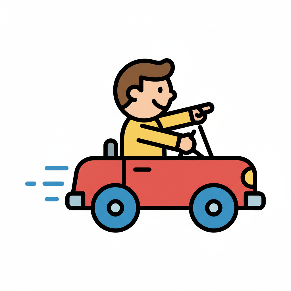 Lachender Cartoon-Fahrer in rotem Cabrio zeigt nach vorne, das Auto fährt schnell.