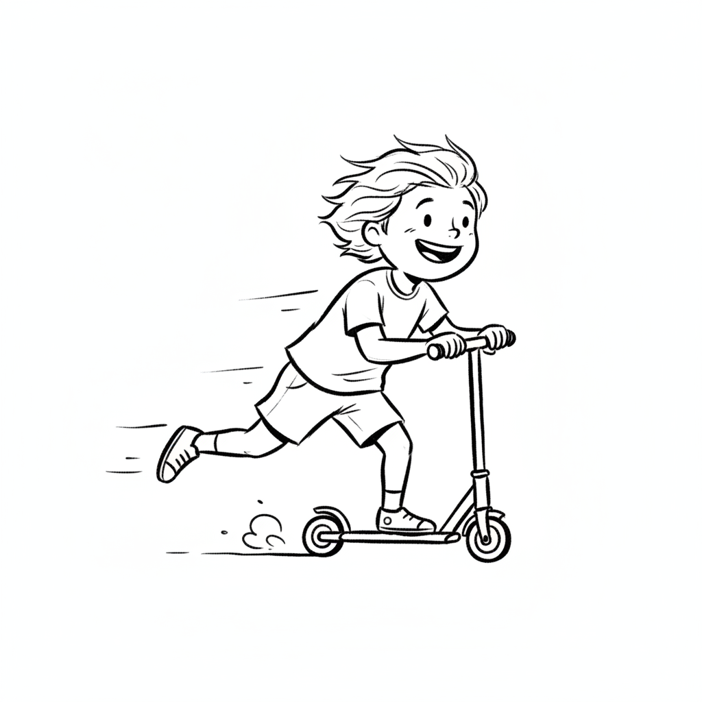Fröhliches Kind fährt Roller, mit wehendem Haar und einem Lächeln. Schwarz-Weiß-Illustration.