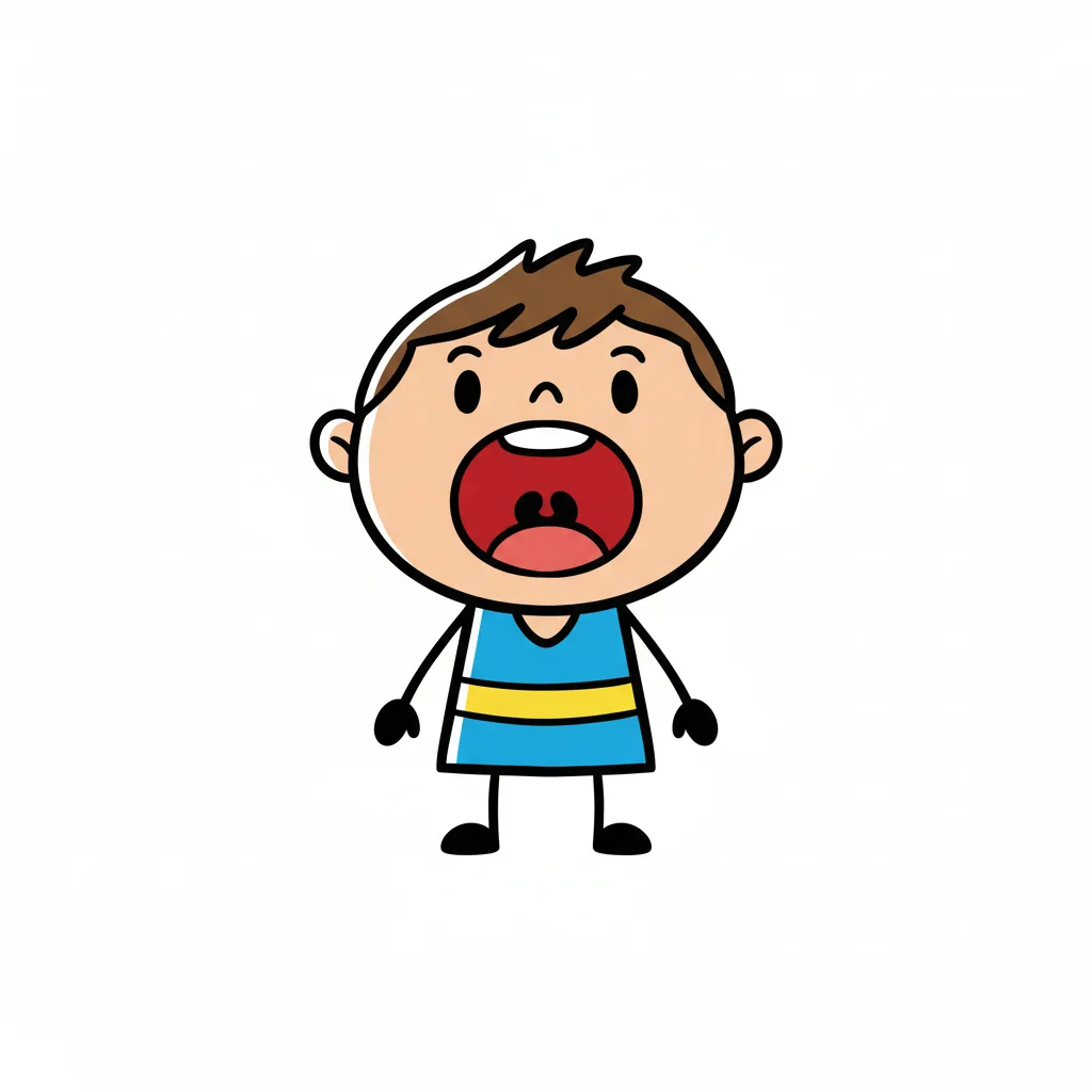 Stilisierter Junge mit weit geöffnetem Mund, der schreit, singt oder gähnt, in blau-gelbem Shirt.