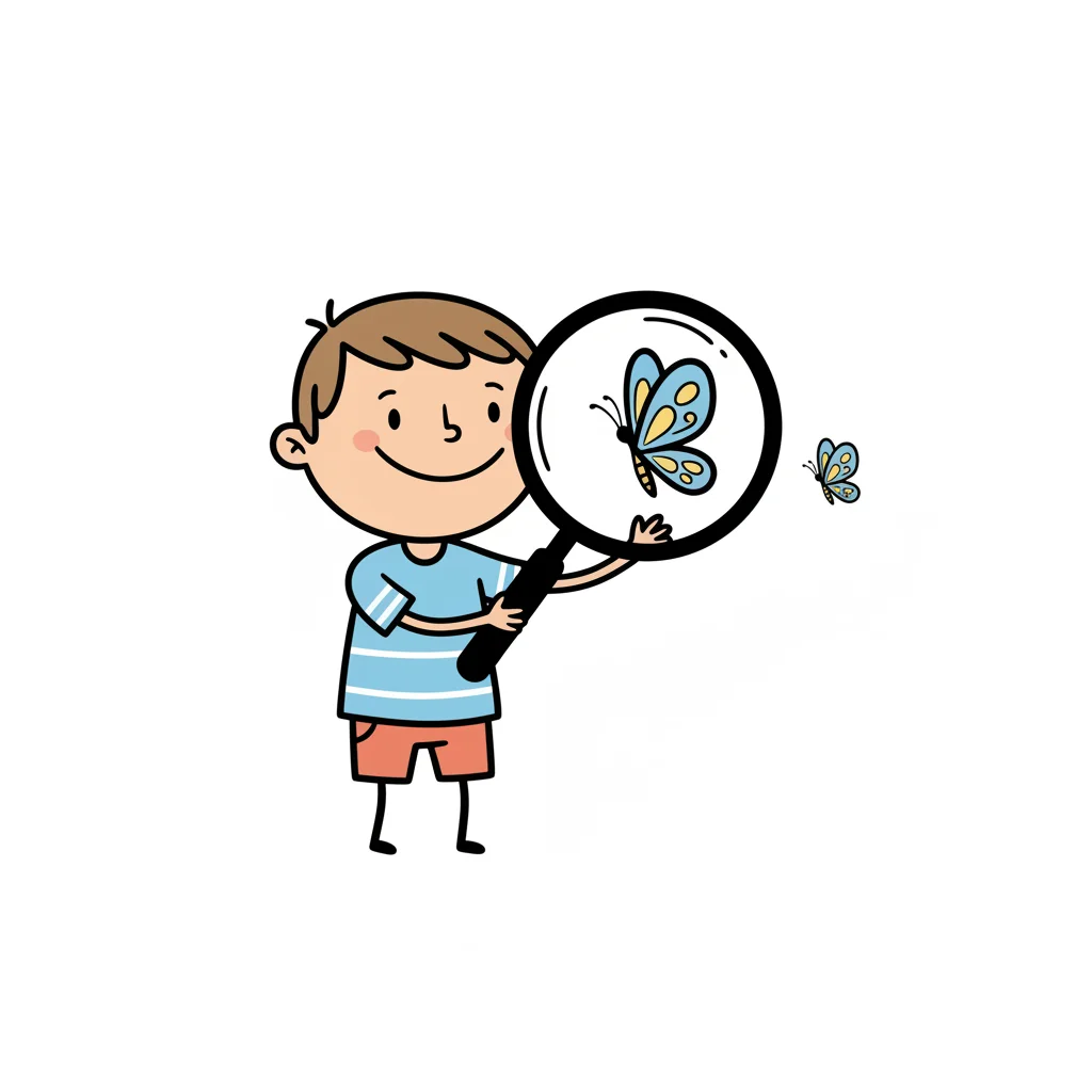 Ein lächelnder Junge beobachtet einen Schmetterling mit einer Lupe. Ein zweiter Schmetterling fliegt vorbei.