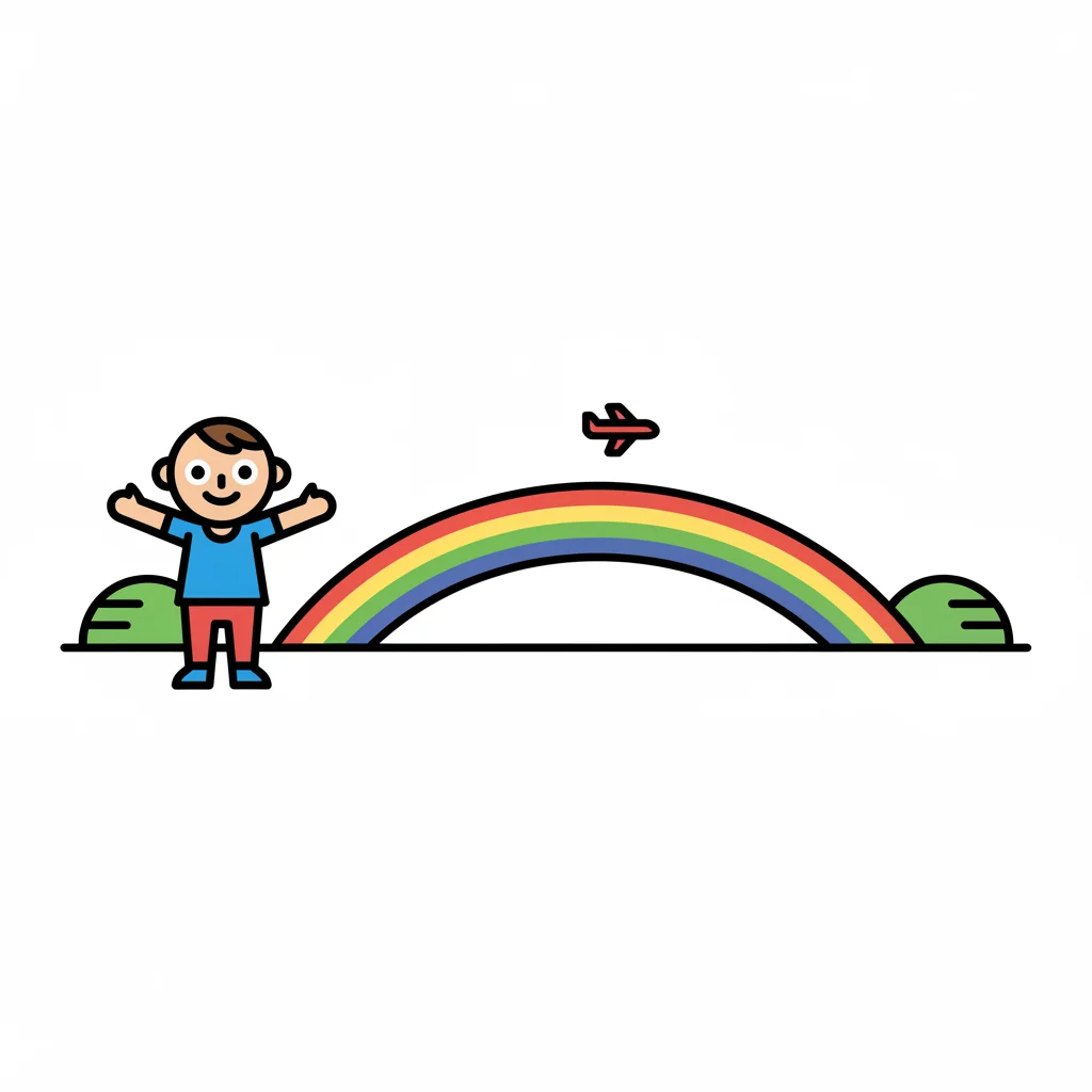 Fröhlicher Cartoon-Junge mit offenen Armen vor einem Regenbogen, über dem ein Flugzeug fliegt.
