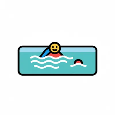 Ein lächelnder Mensch schwimmt in einem Pool, umgeben von Wellen. Ein weiteres Objekt ist im Wasser.