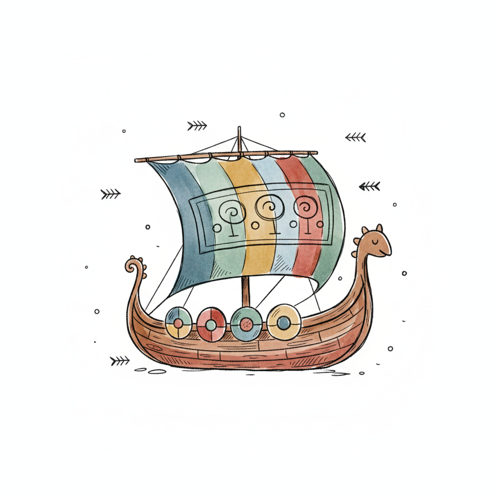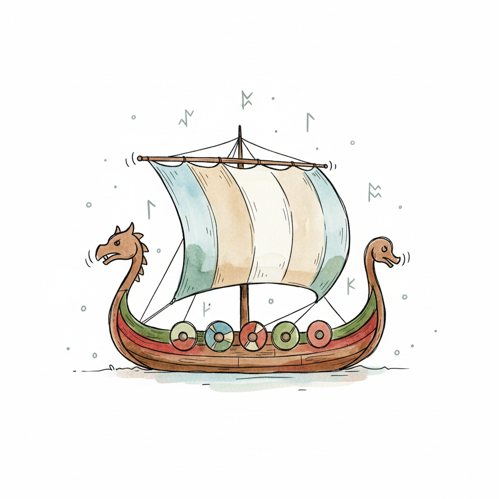 Handgezeichnetes Wikingerschiff mit farbigem Segel, Drachenköpfen und Runen im Hintergrund.