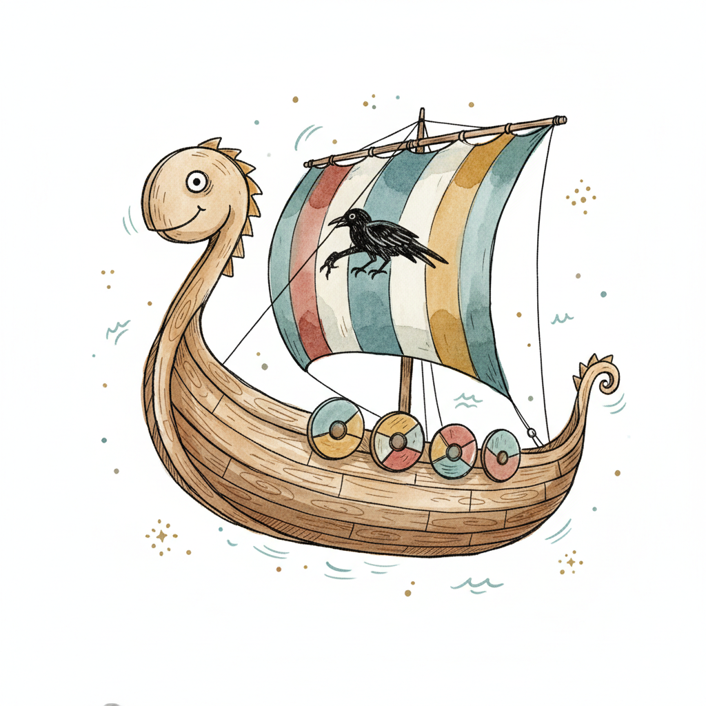 Niedliches Wikingerschiff mit Drachenkopf, gestreiftem Segel und Rabe, im Cartoon-Stil.