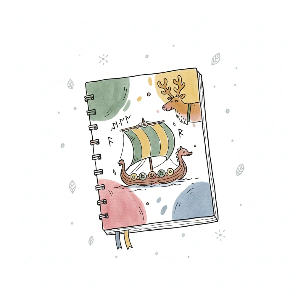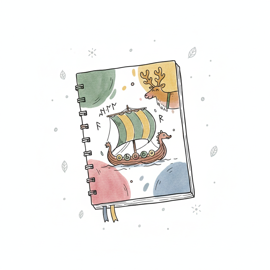 Aquarell-Notizbuch mit Wikingerschiff und Rentier auf dem Cover, umgeben von Blättern.