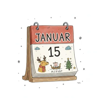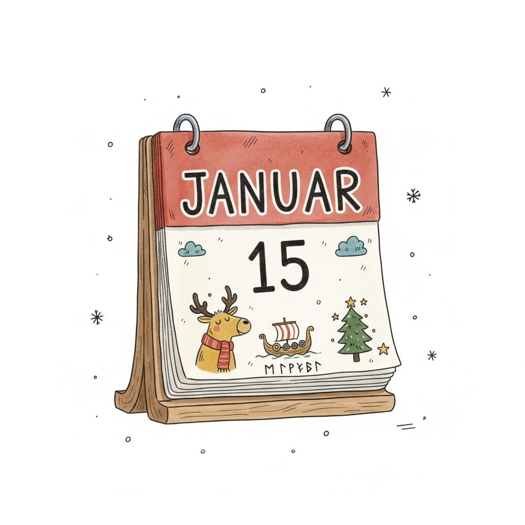 Ein illustrierter Kalender zeigt den 15. Januar mit Rentier, Wikingerschiff und Weihnachtsbaum.