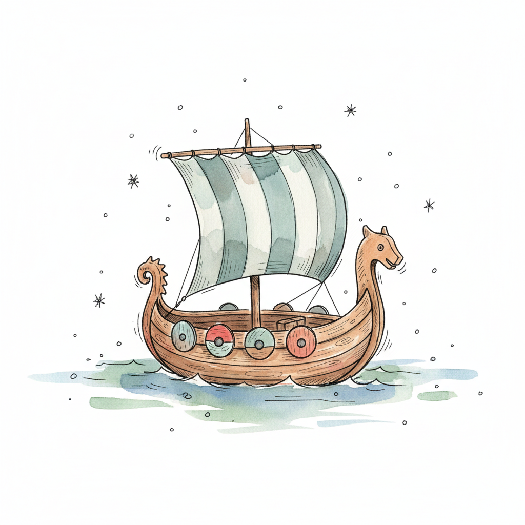 Aquarell-Illustration eines Wikingerschiffs mit Segel, Schilden und Drachenkopf auf dem Wasser.