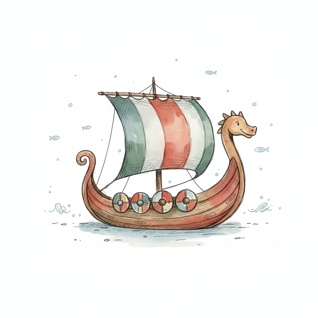 Niedliches Wikingerschiff mit rot-weißem Segel, Drachenkopf und Schilden, im Aquarellstil.
