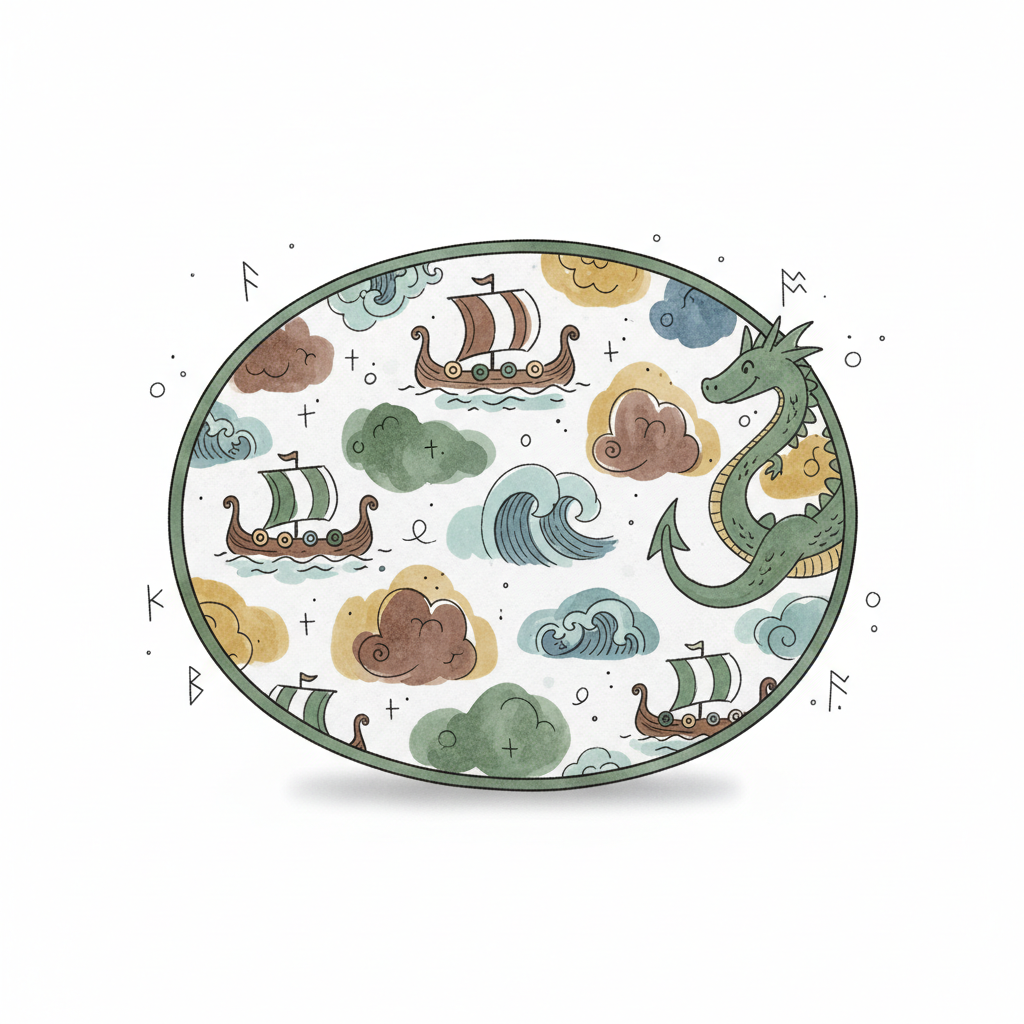 Eine Aquarell-Illustration mit Wikingerschiffen, Wellen, Wolken, einem Drachen und Runen in einem Oval.