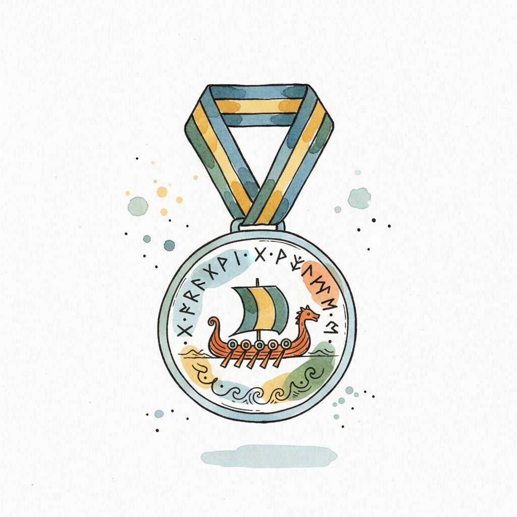 Aquarell-Medaille mit Wikingerschiff, Runen und blau-gelbem Band auf weißem Hintergrund.