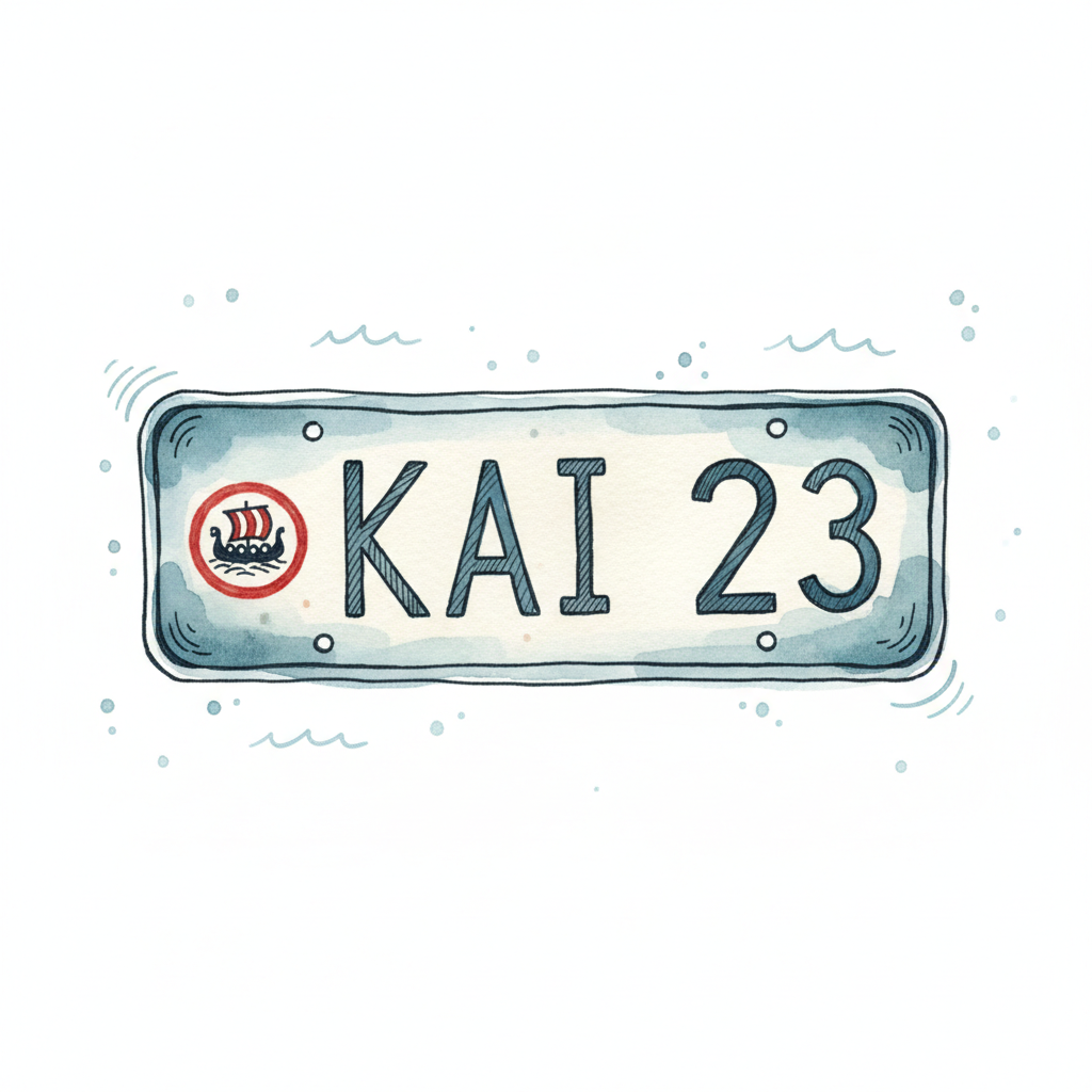 Aquarell-Illustration eines Kennzeichens mit "KAI 23" und Wikingerschiff-Symbol.