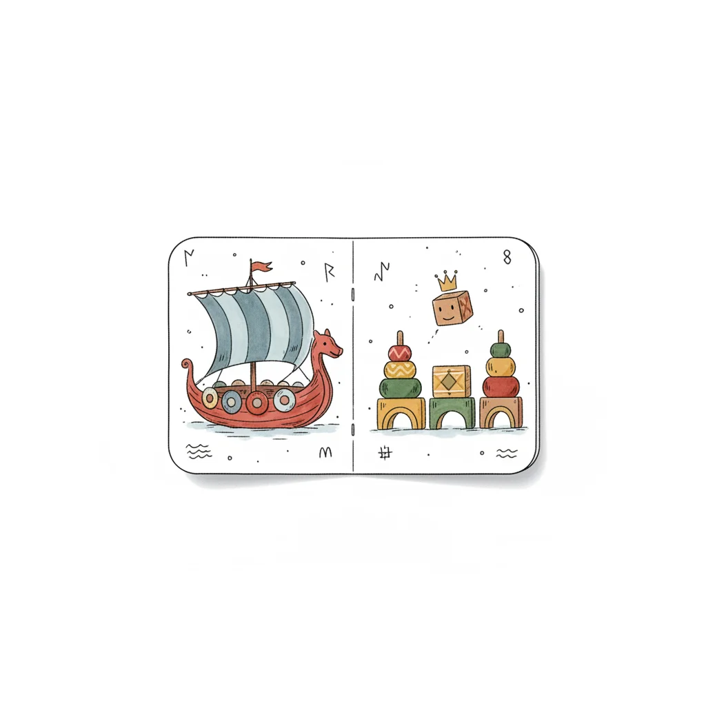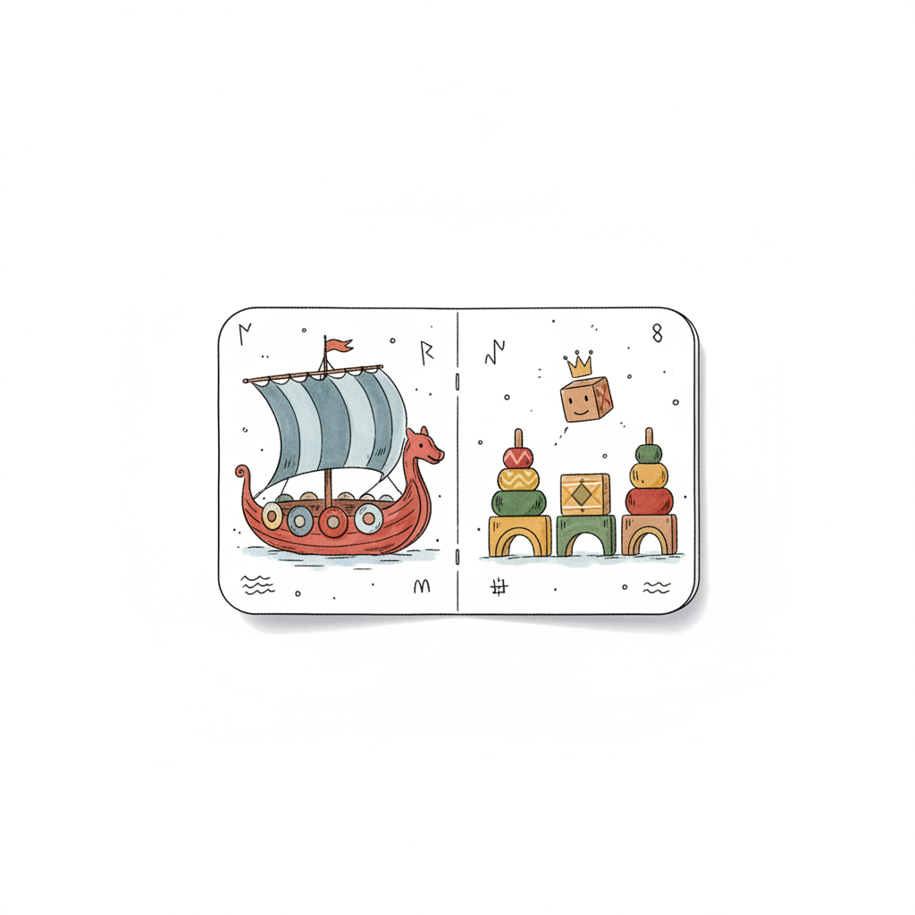 Eine Spielkarte mit einem Wikingerschiff und Holzspielzeug wie Stapelringen und Bausteinen.