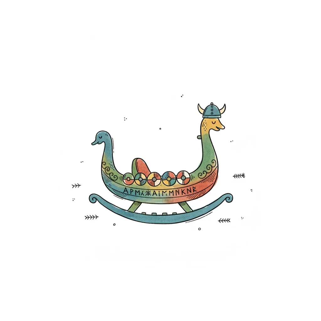 Illustration eines farbenfrohen Wikingerschiff-Schaukelpferds mit Drachenkopf und Runen.