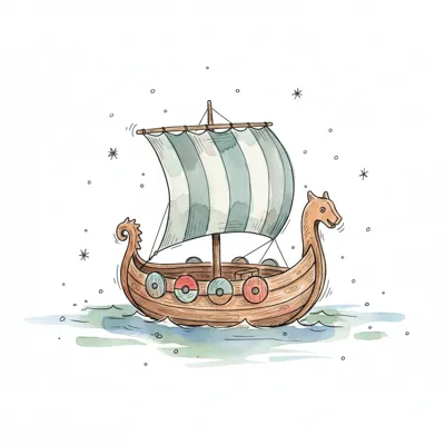 Niedliches Wikingerschiff mit Drachenkopf und gestreiftem Segel im Aquarellstil.