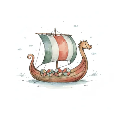 Niedliches Wikingerschiff mit bunten Segeln und Schilden, im Aquarellstil gezeichnet.