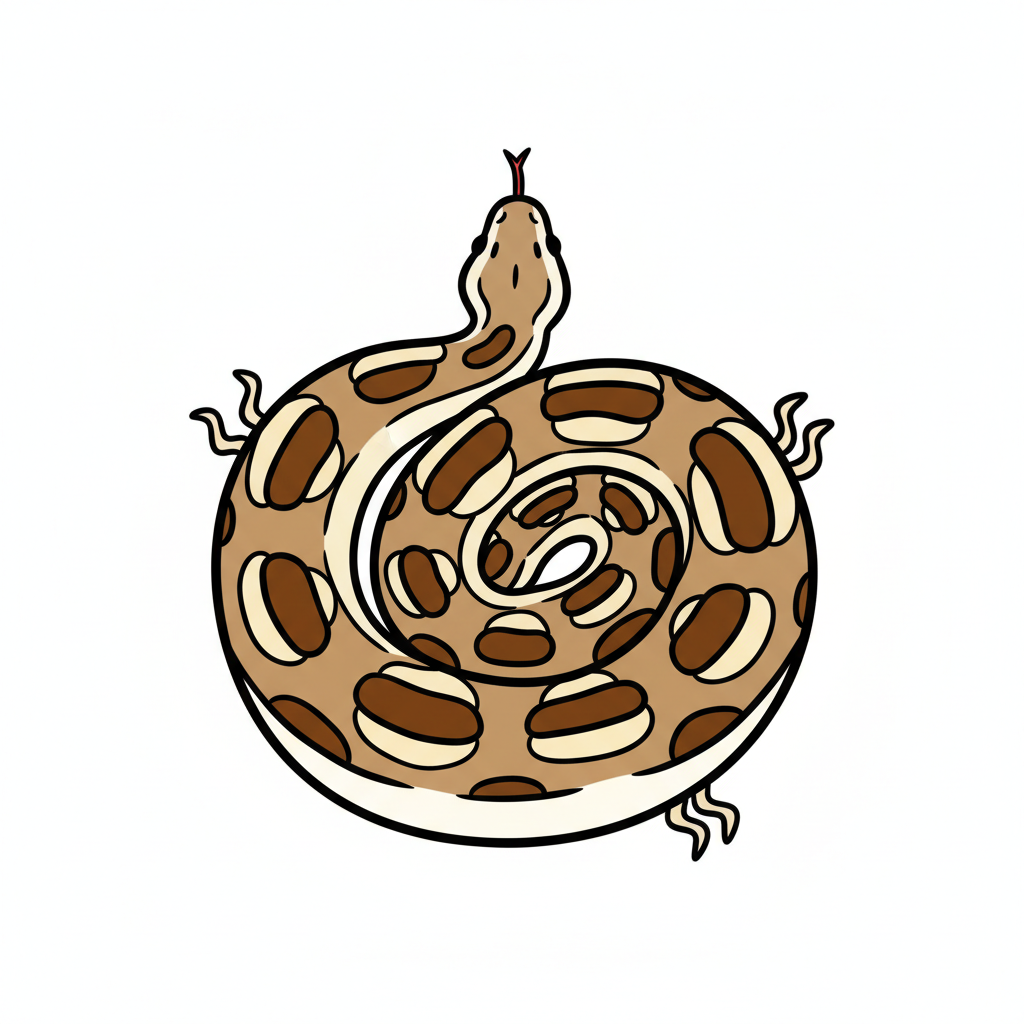 Eine cartoonhafte Schlange mit braunem Muster, die sich spiralförmig windet.