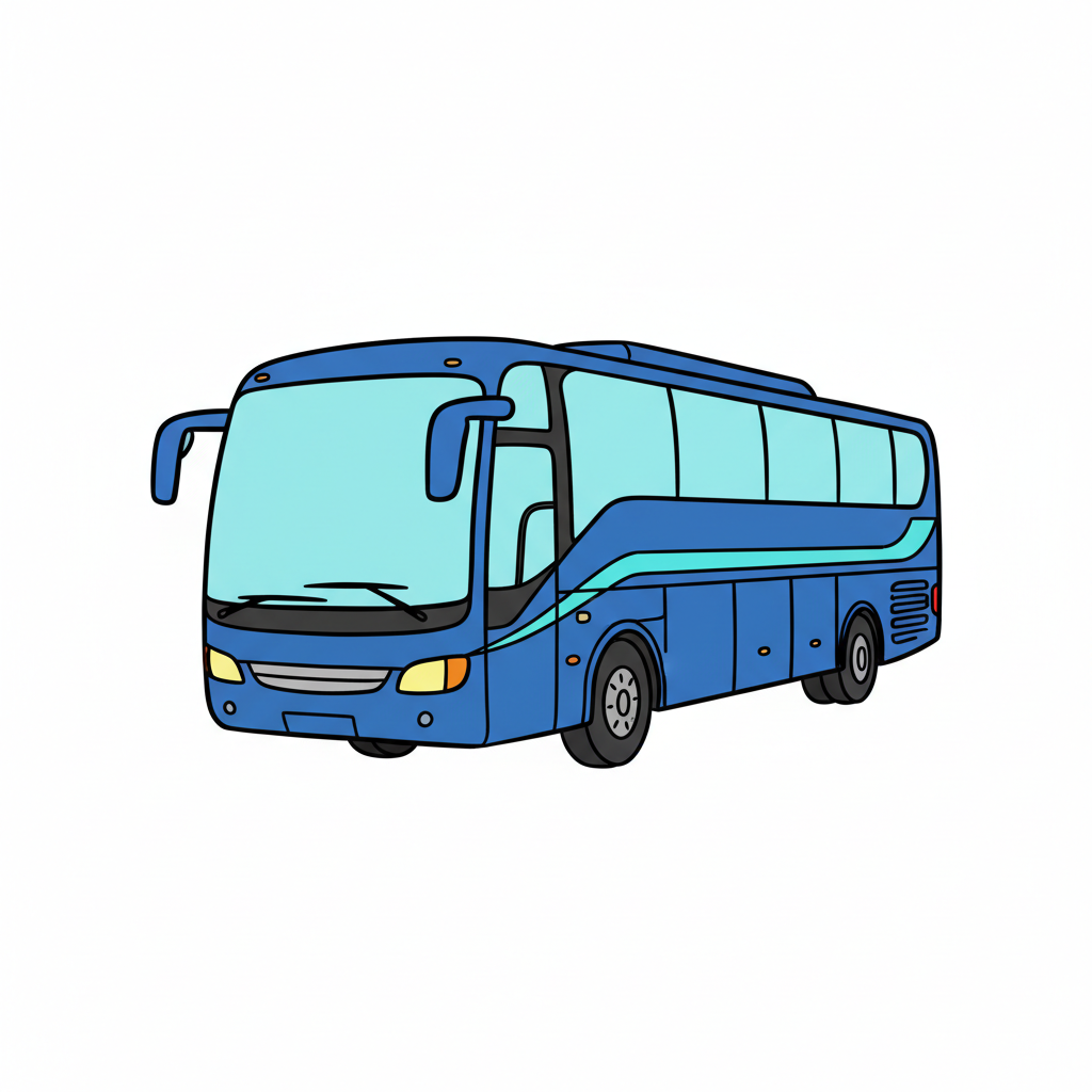 Blauer Reisebus mit großer Windschutzscheibe und seitlichen Fenstern.